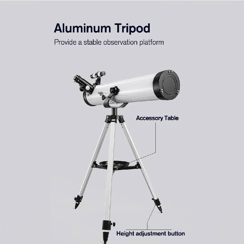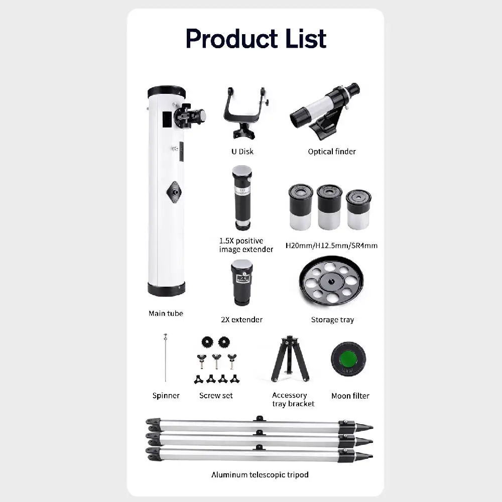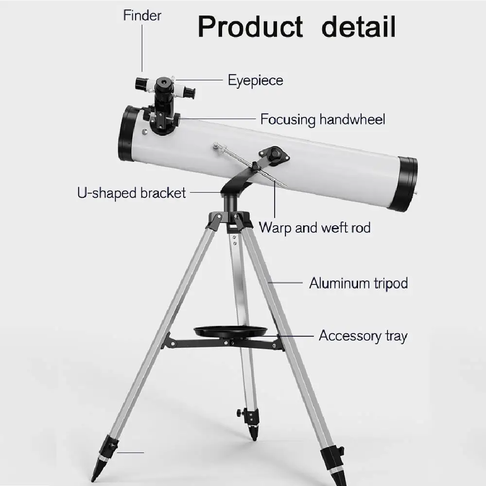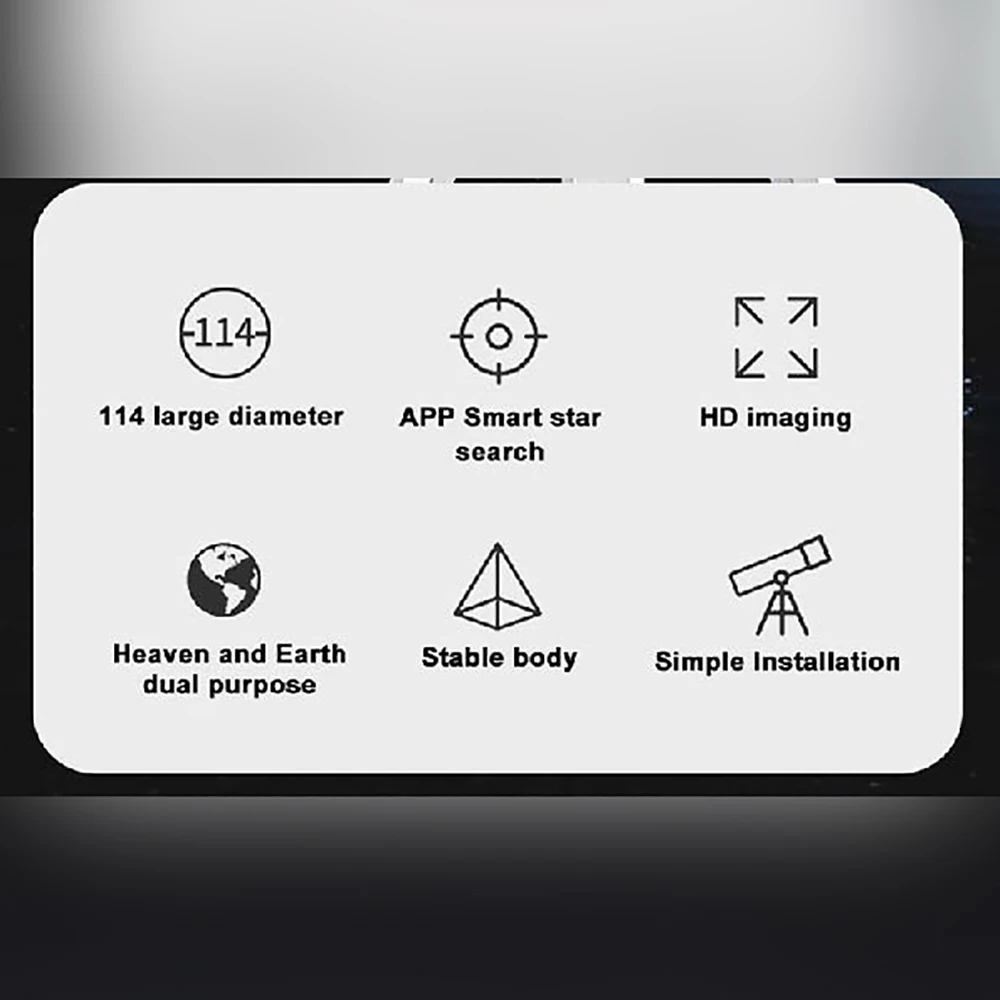 The 1.35X-875X reflecting telescope, with a 114mm aperture and 700mm focal length refraction design, provides excellent optical performance and allows you to easily observe deep sky objects in the universe.